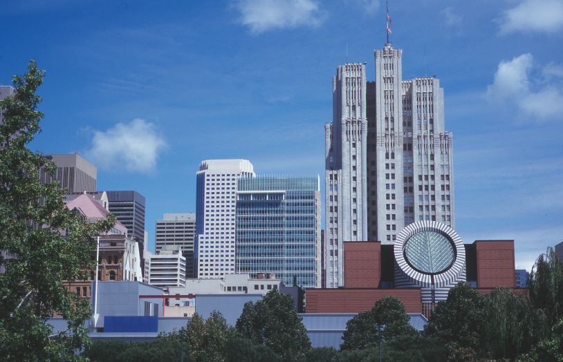 Far and away my favorite gallery was SFMOMA, the San Francisco Museum of Modern Art. It's the red-roofed building at bottom right with a circular skylight. Seen here from Buena Vista Gardens. |