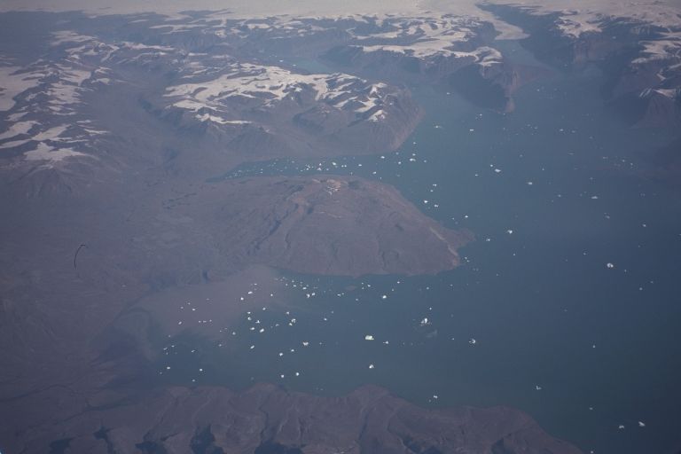 On the way out we flew over Greenland. Notice the frozen river turning to water near top right. Too much haze from 35,000 feet, I'm afraid, and they refused to stop the plane directly above it so I could get my camera out. |