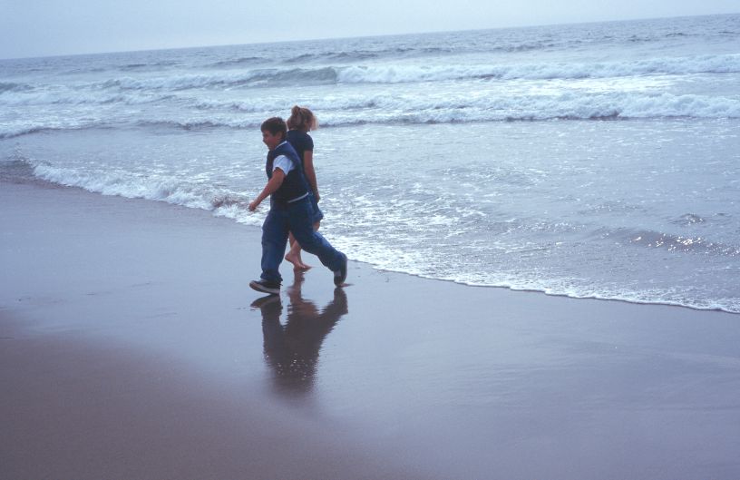 So I walked along it, and got my feet wet in the Pacific. These two kids have just found a Susan B Anthony dollar coin in the surf a couple of yards below high water. No kidding. |
